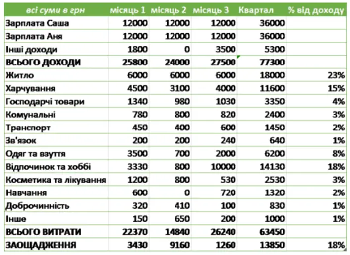 У такій формі чітко видно хто та на що витратив кошти, а також скільки вдалось заощадити у кожному місяці.