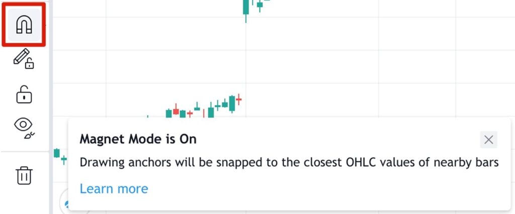 - Увімкніть інструмент «magnet» (іконка магніту). Це дозволить лініям автоматично прив’язуватись до найближчих точок OHLC, щоб результат був точнішим.
