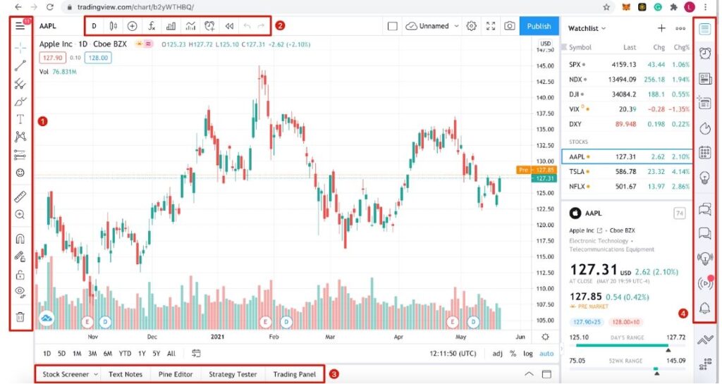 Люди, які вперше користуються інструментами для побудови графіків, можуть не зрозуміти особливості інтерфейсу TradingView. Але щоб навчитися нею користуватись, варто розглянути основні елементи.