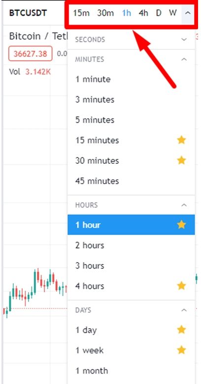 Ще однією важливою функцією є можливість налаштування інтервалів свічок та інших символів. Щоб це зробити, потрібно перейти до верхньої панелі і натиснути крайню кнопку зліва. Там з’явиться довгий список різноманітних інтервалів (від секундного до місячного). Інтервали які використовуєте найчастіше, можна додати в обране. Тоді вони будуть відображатися на верхній панелі.