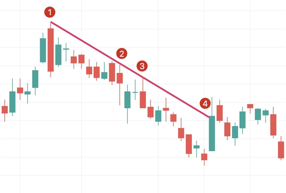 - На графіку точки опору зазначені цифрами 1, 2 і 3. Щоб перевірити лінії тренду бажано мати принаймні три точки. На четвертій точці показано прорив тренду. Якщо таке стається, потрібно побудувати нову лінію тренду.