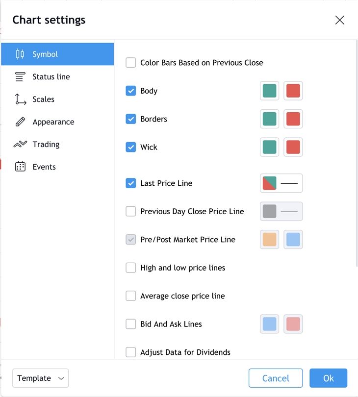 За допомогою «Appearance» можна змінювати лінії сітки, міняти колір фону, осі. Іншими словами, косметично трансформувати картинку. Налаштування візуальних елементів можливо і через «Trading», достатньо тільки перейти до брокерського акаунту. Тоді як в «Events» є можливість побачити дивіденди, поділи та події на графіку.