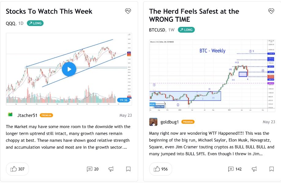 - Можна знайти багато інвестиційних ідей, співпрацюючи з іншими користувачами. Для спілкування з досвідченими трейдерами або обговорення нових стратегій використовується функція чату. Можна також переглядати опубліковані ідеї та відтворювати їх на інтерактивному графіку, для оцінки точності прогнозу.